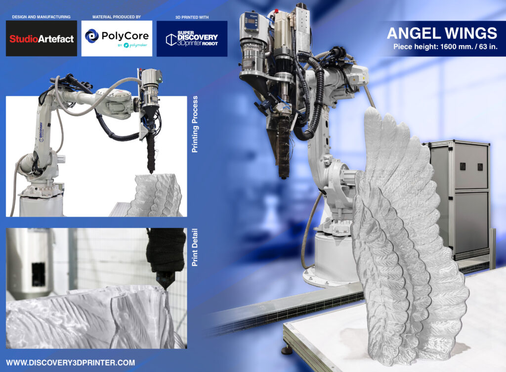 Through a collaboration agreement with Studio Artefact, we created a copy of the wings using Polymaker’s PolyCore™ PETG-1000 material—an optically transparent material perfect for indoor applications such as luminaires, furniture, and decorative pieces—and our Super Discovery 3D Printer Robot, located in the R&D workshop at our production facility in Valdepeñas, Spain.